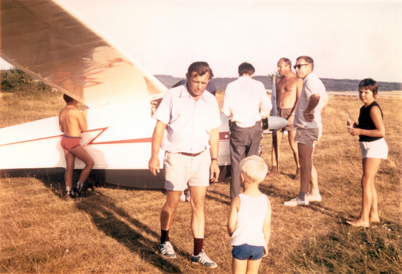 Einige Kameraden mit dem Motorspatz (SF 24) auf dem Grasberg. Vorne Eberhard Hanusch, im Profil neben dem Propeller Arthur Siegler und im Hintergrund Klaus Potthast (Aufnahme vermutlich von 1973).